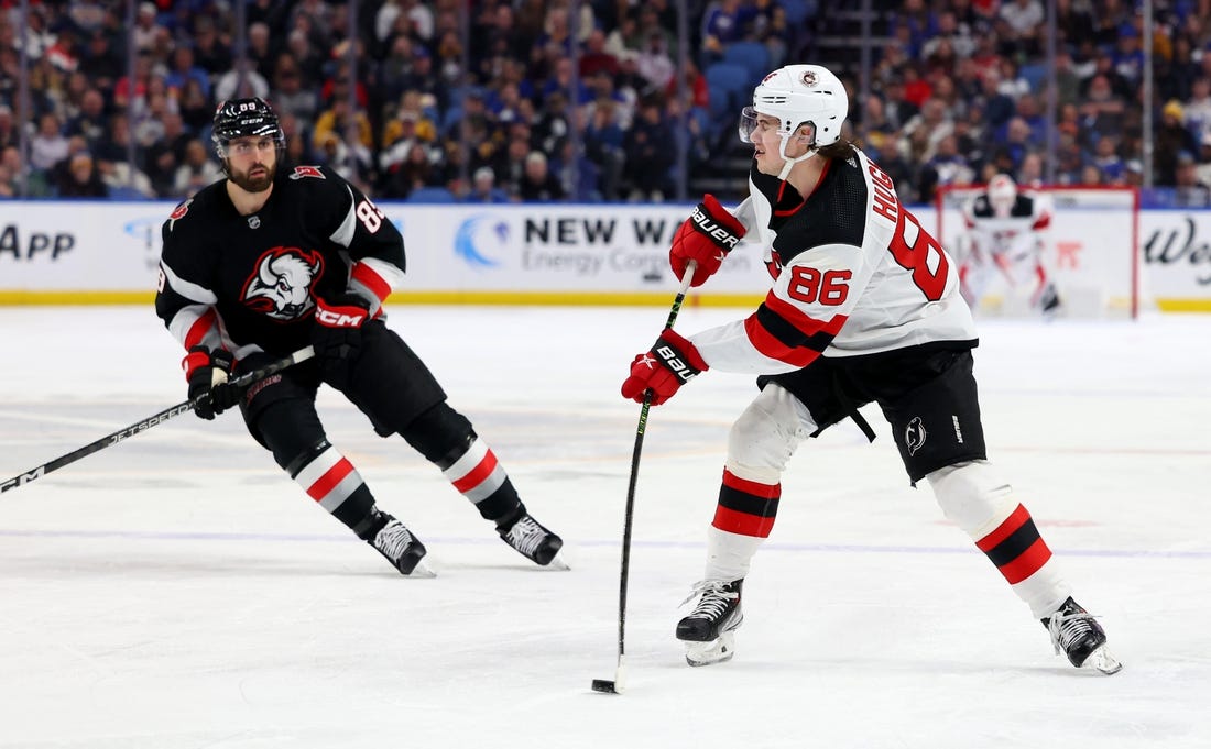 Jack Hughes collected two goals and an assist in New Jersey’s 5-4 setback to the host Buffalo Sabres on Friday. The Devils scored two goals in the third period before seeing their comeback bid fall just short as they attempted to secure a postseason berth.