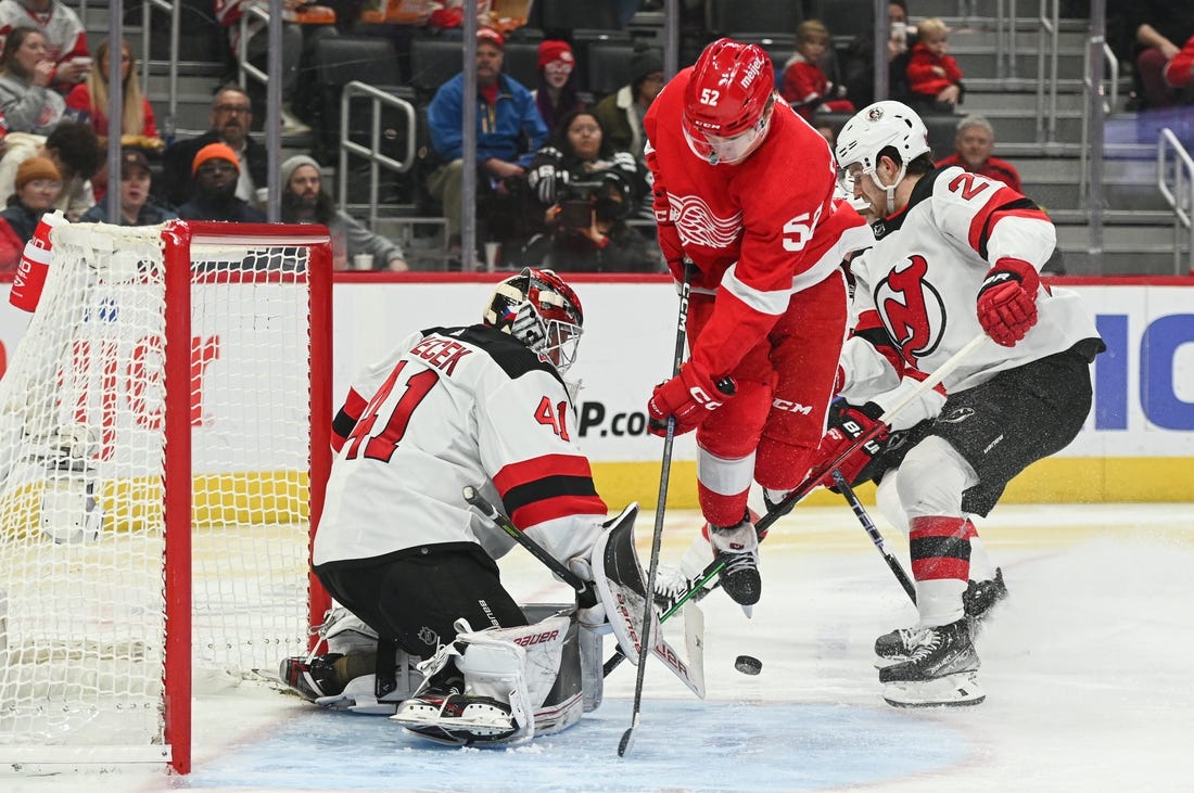 Miles Wood had two assists and Vitek Vanecek made 32 saves in goal for New Jersey, which has won both games against the Red Wings in Detroit this year.
