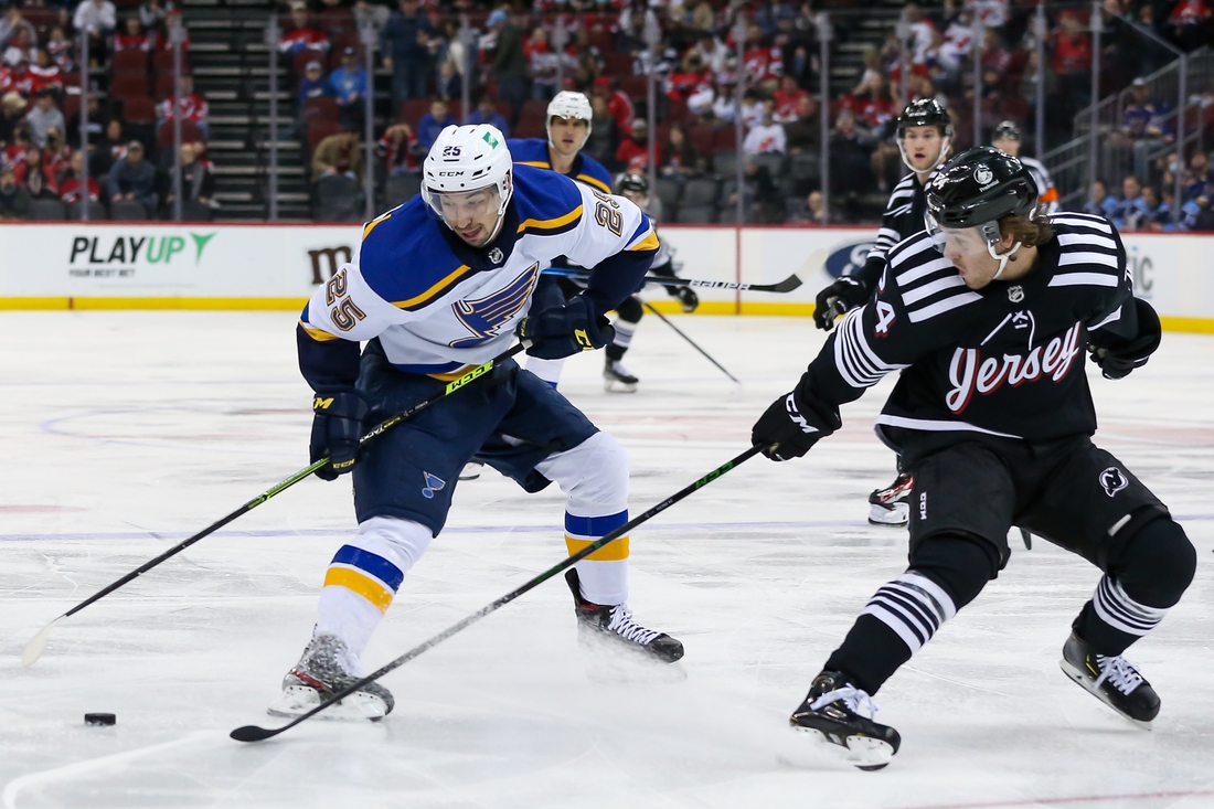 Devils forward Pavel Zacha nearly scored with a turnaround shot from the slot with 3 minutes left in the period, but he hit the post. Blues forward Ivan Barbashev nearly tied the game, but he scored just after time expired in the first period.