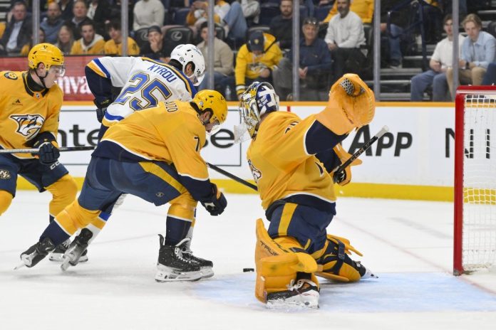 St. Louis finally got on the board with 9:25 left in the second. Off a Nashville turnover, Holloway’s drive went through the legs of the Predators’ Michael McCarron and just by a late-reacting Saros.