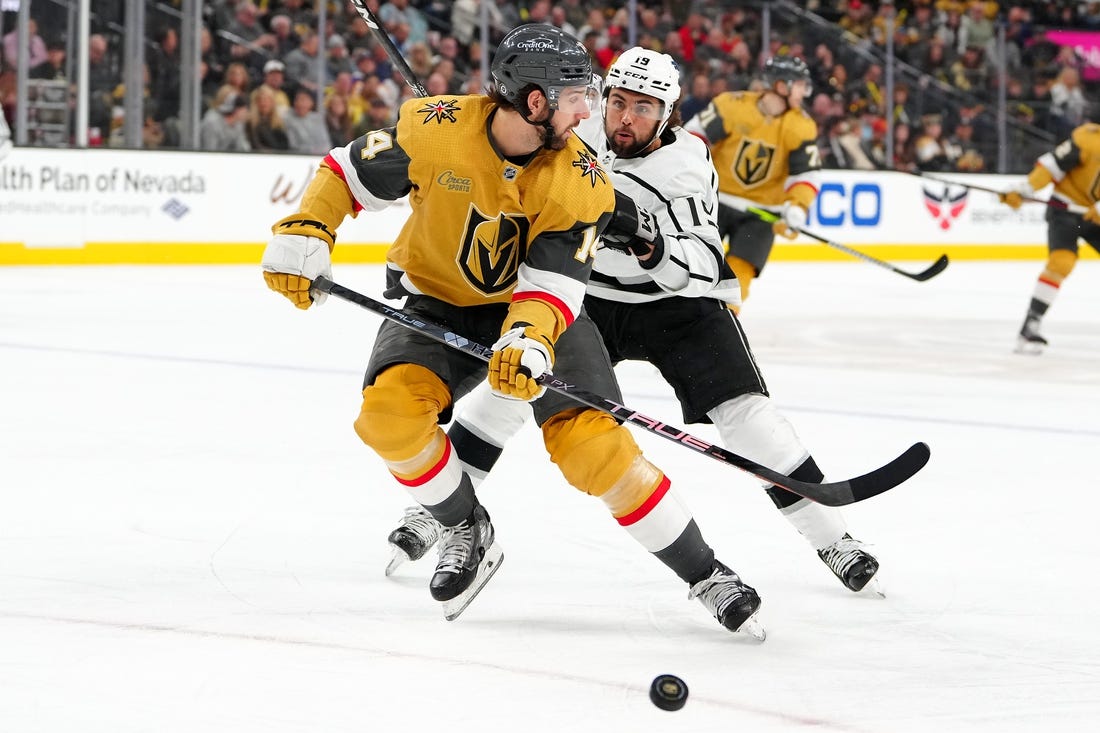 Los Angeles appeared to take a 1-0 lead on its first shot of the game when Kopitar fired the puck past a Quinton Byfield screen. However, that score was overturned when Vegas successfully challenged that the Kings were offside on the play.