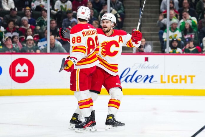 The Flames made it 2-0 in the final minute of the first period. Yegor Sharangovich passed the puck to Elias Lindholm, who promptly found Huberdeau skating left to right near the front of the net.