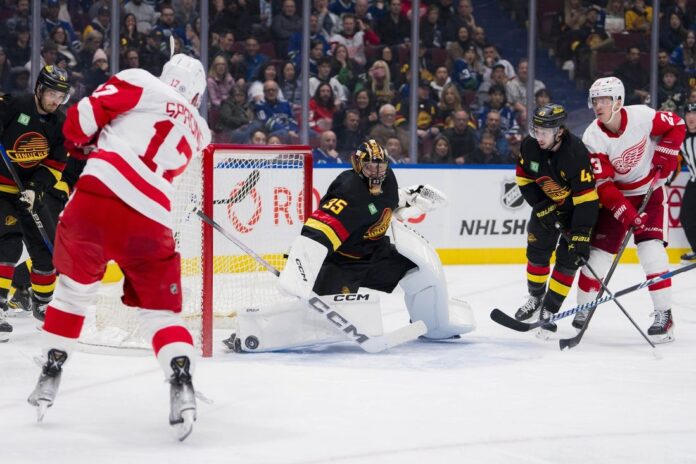 Elias Lindholm scored twice and Elias Pettersson had three assists as the Vancouver Canucks became the first NHL team to hit the 80-point mark this season with a 4-1 victory over the visiting Detroit Red Wings on Thursday.
