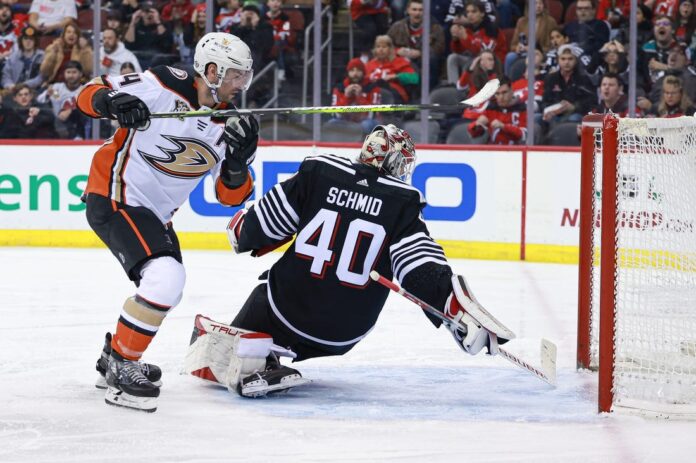 Jesper Bratt was whistled for cross-checking in the final two seconds of a scoreless first to generate the power play that yielded Henrique’s first goal 1:46 into the second. Henrique redirected Pavel Mintyukov’s shot from the blue line before the puck skittered between Schmid’s legs.
