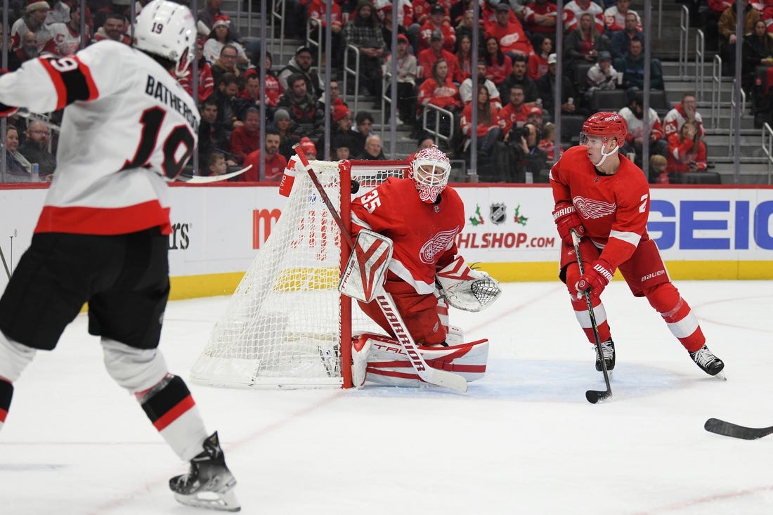 Detroit took a 1-0 lead with 17:28 remaining in the first on a goal by Joe Veleno, who fired a bad-angle shot from the right faceoff circle that trickled through the pads of Ottawa goalie Cam Talbot.
