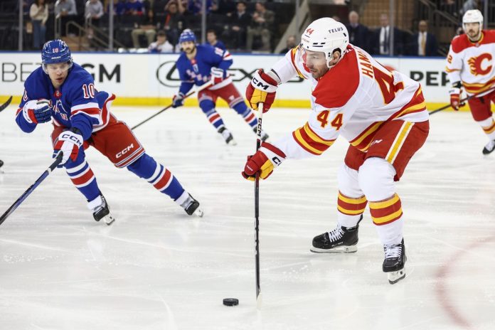Calgary’s Dan Vladar made 12 saves as the Rangers were held to their second-fewest shots on goal this season.