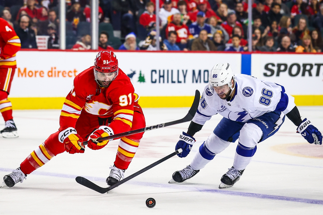 In the first matchup in Calgary on Dec. 12, the Lightning routed the Flames 8-3 as Jake Guentzel (27 goals, 28 assists) notched a hat trick for Tampa Bay.