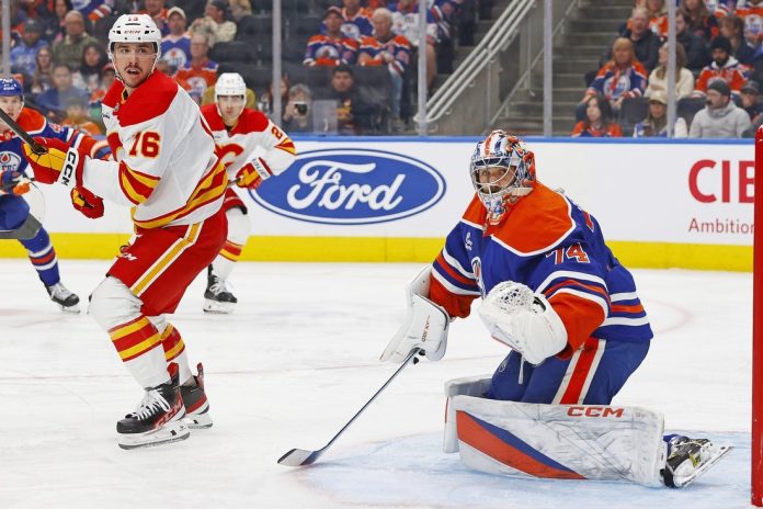 In the first period, Calgary center Morgan Frost sent the puck over the glass for a delay-of-game penalty at 8:51, and the Oilers took advantage. Nugent-Hopkins stuffed the puck across the goal line for a 1-0 lead at 9:53.