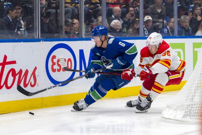The Canucks went on the first of four power plays in the first period after Flames center Kevin Rooney was injured by a legal hit from Miller, resulting in several skirmishes.