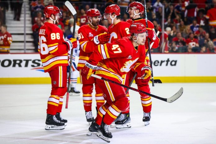 Calgary has won 49 consecutive games when scoring four or more goals, a total hit when Lomberg scored the winner.