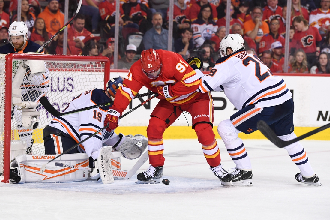 Matthew Tkachuk’s second goal of the game at 8:55 of the third period, a breakaway tally, provided the insurance tally, and he netted an empty-netter to complete his first career playoff hat trick and finish the highest-scoring playoff game in Battle of Alberta history.