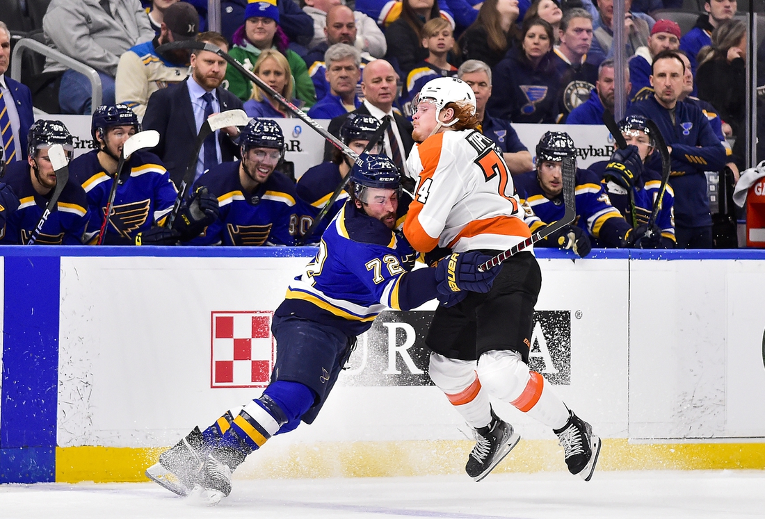 Travis Konecny scored two goals to help lift the Philadelphia Flyers past the host St. Louis Blues 5-2 on Thursday.