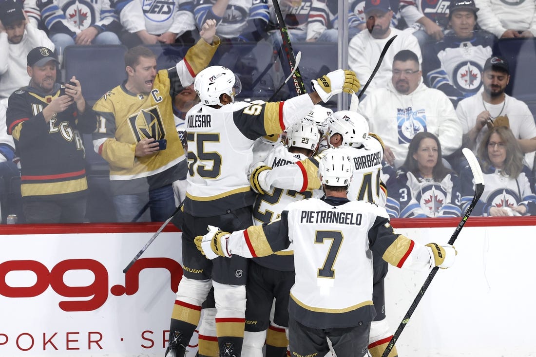 Amadio, who has bounced between the first and fourth lines and played center and both wing spots during the season, was in the right spot at the right time. Jets defenseman Dylan Samberg’s clearing pass from the end boards ricocheted off the shin guard of Vegas forward Ivan Barbashev right to Amadio, who quickly unleased a spinning slap shot over the glove of Connor Hellebuyck.