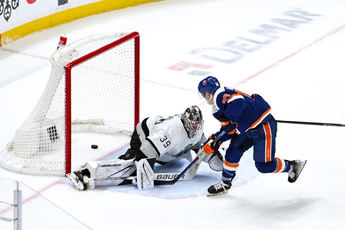 Los Angeles was close to starting the season with 12 straight road wins but wound up blowing a two-goal lead. They settled for a point when Cam Talbot allowed Jean-Gabriel Pageau to score on a breakaway 13 seconds into overtime of a 3-2 road loss to the Islanders after conceding a pair of goals to Anders Lee on rebounds.