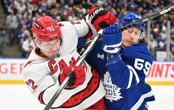 Bunting, a former Maple Leafs player, scored during a power play at 2:24 of the first period. Aho’s pass from the end boards into the slot set up Bunting, who slid the puck through the five-hole for his eighth goal of the season. Matthew Knies was off for hooking.