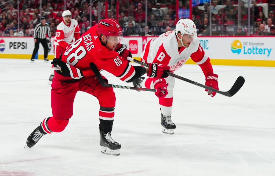Necas, on the night that fans were presented with his bobblehead, was the recipient of Evgeny Kuznetsov’s pass through the legs of Red Wings center Robby Fabbri. Necas converted for his 23rd goal of the season and his first in five games.