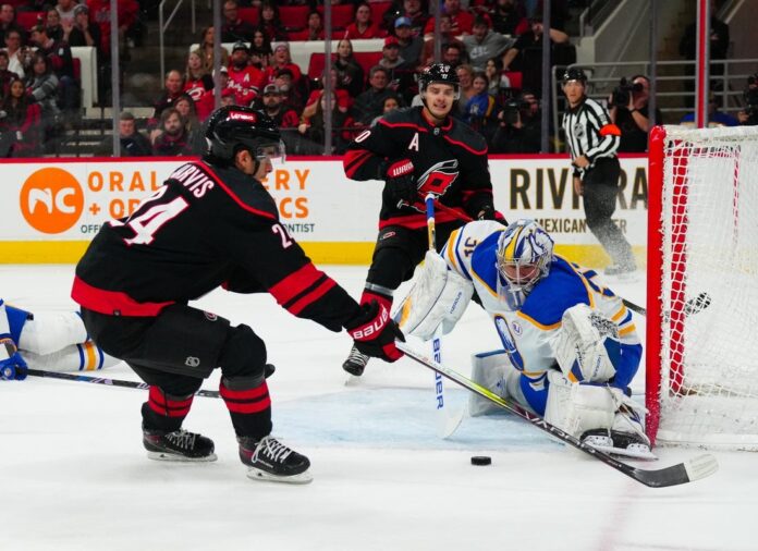 Aho took advantage of a power play to push it to 3-0 at 1:06 of the second period. Svechnikov sent a short pass from the top of the left circle to Aho in the high slot to send it past Comrie, who was screened by Buffalo defenseman Erik Johnson, just 13 seconds into the man advantage.