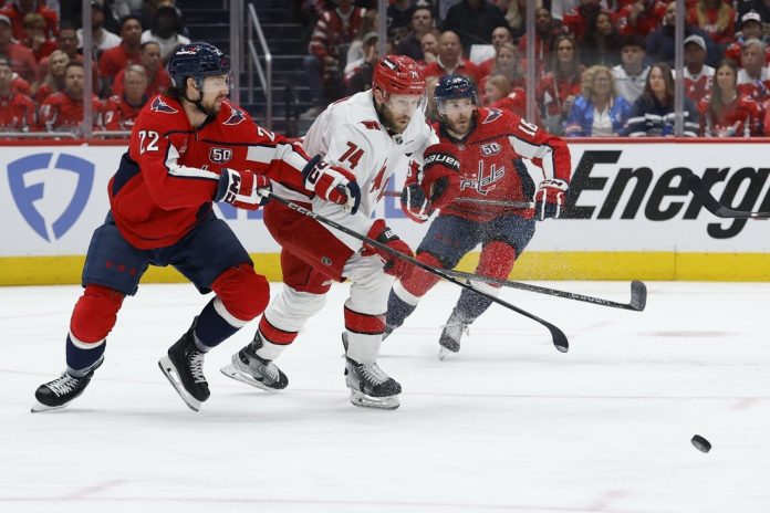 Matt Roy appeared to give Washington the lead less than three minutes into the second period, but Carolina won a replay challenge showing Connor McMichael was barely offside moments earlier. Then, just before the second-period horn, Jarvis’ shot beat Thompson, but the puck bounced off the crossbar.