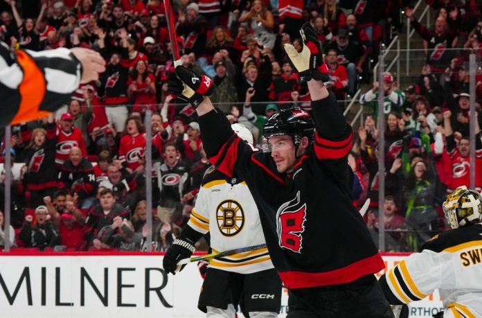 Roslovic’s fifth goal of the season came 6:28 into the game. With a Boston delayed penalty pending, the Hurricanes took advantage of sending in an extra skater and benefited from crisp puck movement.