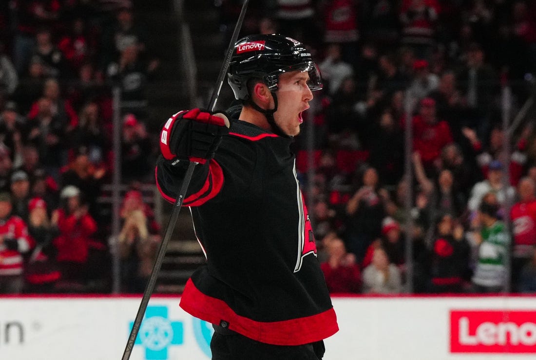 Sebastian Aho also tallied in that game and leads the team with 18 goals, two more than Necas, Jarvis and Teravainen.