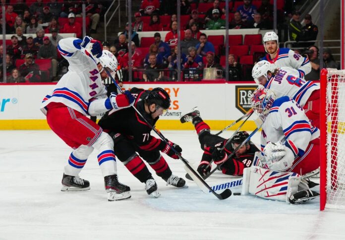 There was a furious stretch early in the third period. Carolina’s Andrei Svechnikov blasted a shot that was deflected by Shesterkin and bounced off the post. Shortly after, the Rangers had a two-on-one at the other end, with Kochetkov stopping ex-Hurricanes forward Vincent Trochek’s tip-in shot.