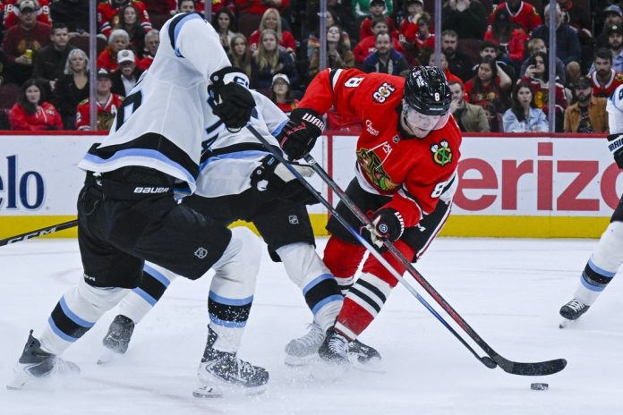 A prime Utah scoring chance dissolved shortly before Chicago’s initial goal, as Dylan Guenther, darting toward the crease, was unable to get a stick on Peterka’s pass from the left wing.