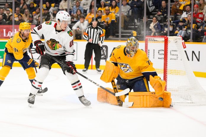 The Blackhawks outshot the Predators 9-5 in the first but were stymied by Predators netminder Juuse Saros (24 saves), including two solid chances from Frank Nazar.