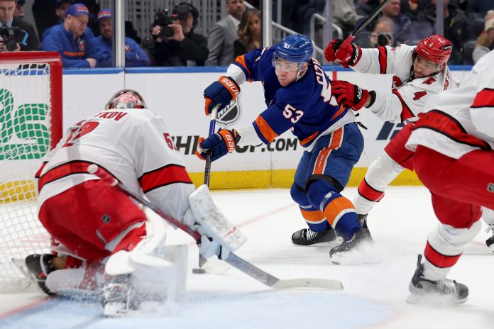 Ilya Sorokin replaced Hogberg and stopped Seth Jarvis at the 1:27 mark. Seconds later, New York’s Kyle Palmieri picked off a pass by Hurricanes right winger Andrei Svechnikov that was headed toward the Islanders’ crease. The center dished to Nelson to begin a 2-on-1 that ended with Nelson firing a shot into the far corner of the net from the right faceoff circle.