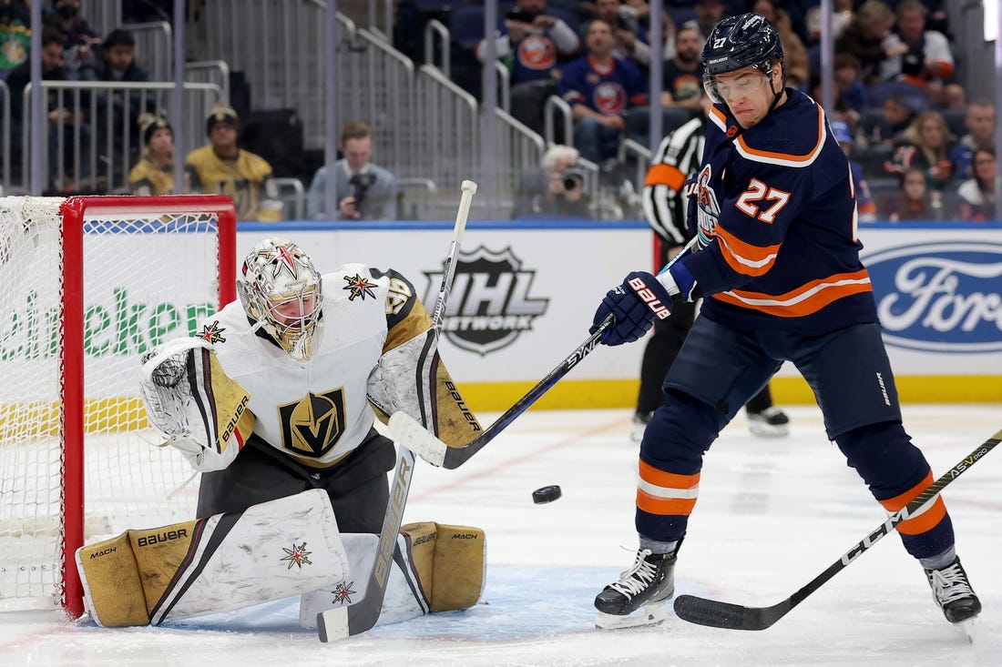 Following a scoreless first period that saw Vegas defenseman Shea Theodore fire a shot off the post and Thompson stop Beauviller’s point-blank try at the end of a two-on-none break with Barzal, the teams traded goals in the second period.
