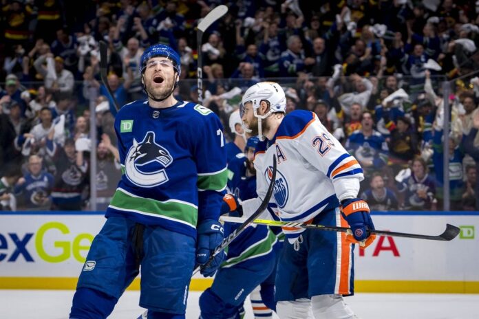 Di Giuseppe again pulled the Canucks even at 5:14 of the second period. Nils Aman created a turnover by Edmonton’s Evan Bouchard, and Di Giuseppe converted for his first career playoff goal.