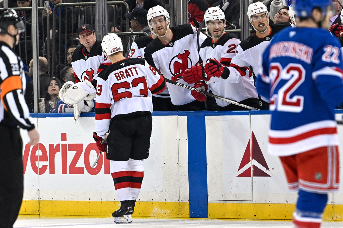 After Devils defenseman Johnathan Kovacevic broke up a pass between Filip Chytil and Braden Schneider, New Jersey’s Ondrej Palat gained possession near the right corner and spotted Bratt in the neutral zone. Bratt sped through the slot and finished off a two-on-one with Hughes by putting a shot from the right circle under Shesterkin.