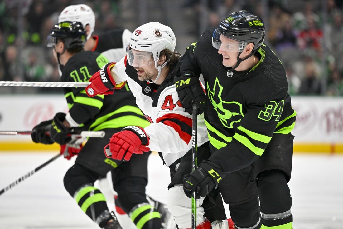 Ty Dellandrea and Roope Hintz scored for the Stars during a dominant first period that saw Dallas outshoot New Jersey by a 13-5 margin.