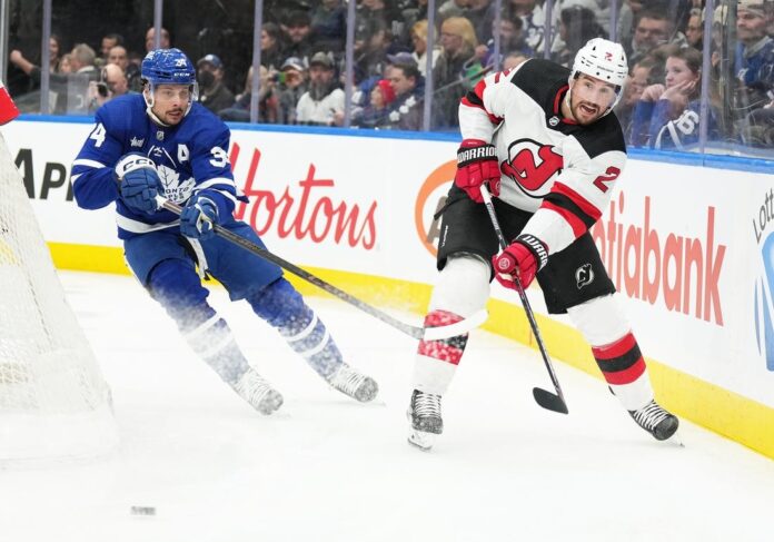 Jack Hughes scored two goals late in the third period to clinch the New Jersey Devils’ 6-3 victory over the host Toronto Maple Leafs on Tuesday.