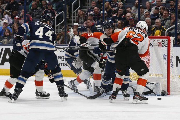 The Jackets outscored the Flyers 2-1 in the middle period and held a 4-1 lead heading to the third.