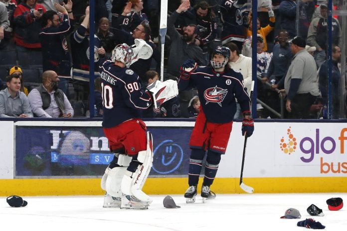 Kent Johnson added three assists and Elvis Merzlikins made 24 saves.