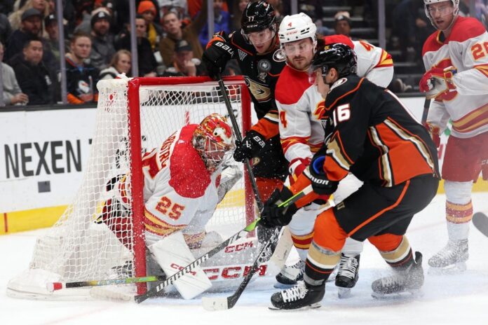 The Flames had 44 shots on goal to 25 for the Ducks while ending a four-game road losing streak.