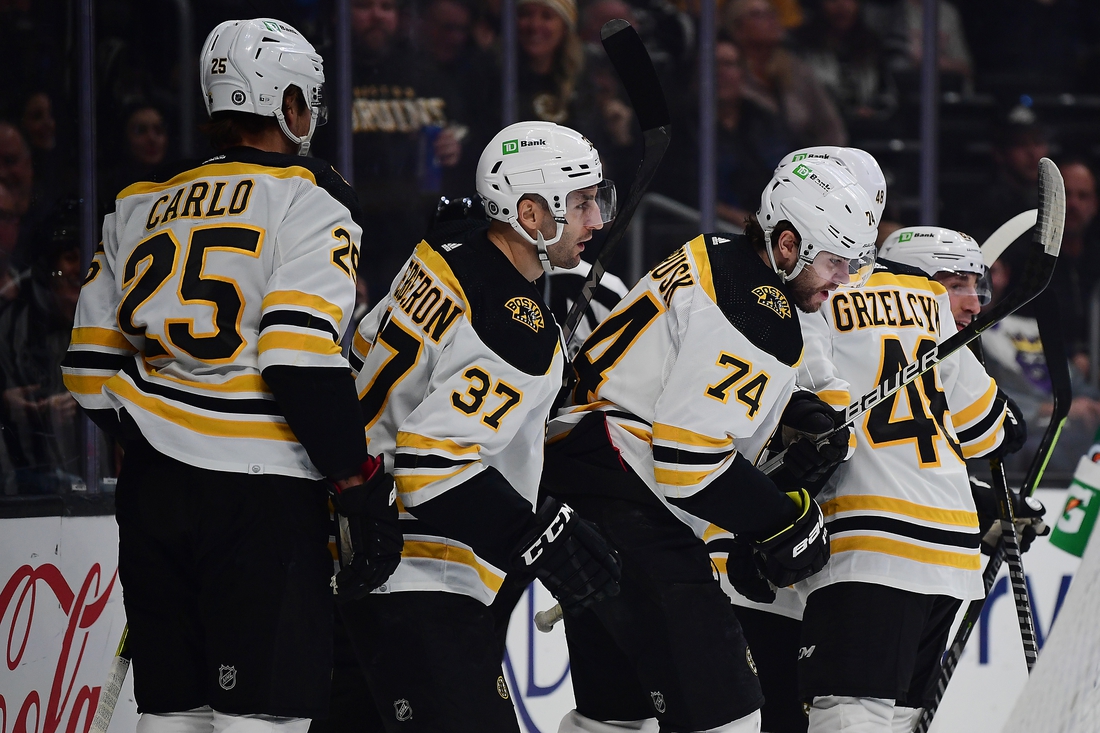 The third goal came just 53 seconds into the second period when DeBrusk deflected a shot by Bergeron past Quick for his 14th of the season.