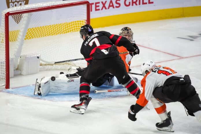 Ottawa’s third power-play goal gave the Senators a 5-2 lead at 1:32 of the third period as Tkachuk scored from point-blank range.
