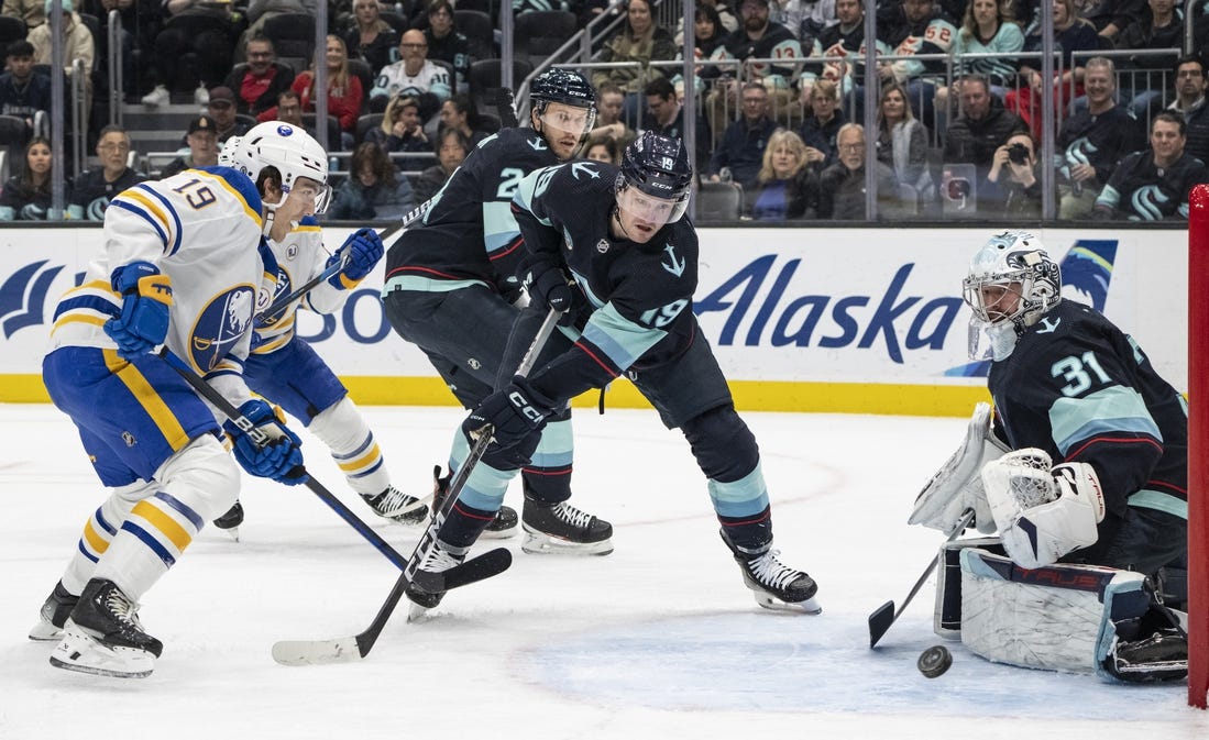 Zemgus Girgensons added two assists and goaltender Ukko-Pekka Luukkonen made 32 saves as Buffalo beat the Kraken for the first time in six all-time meetings.
