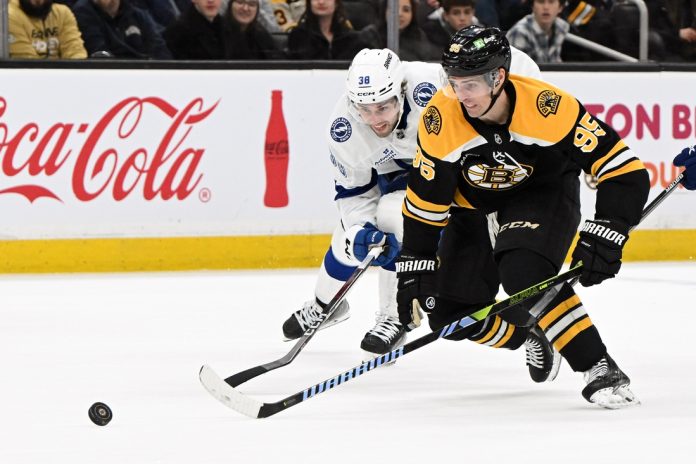 With the teams playing four-on-four, Pastrnak slotted home Boston’s fourth goal at 6:05. After Vasilevskiy stopped Morgan Geekie in the slot, Zacha recovered the puck and dished it to Pastrnak to snap home from the left circle.