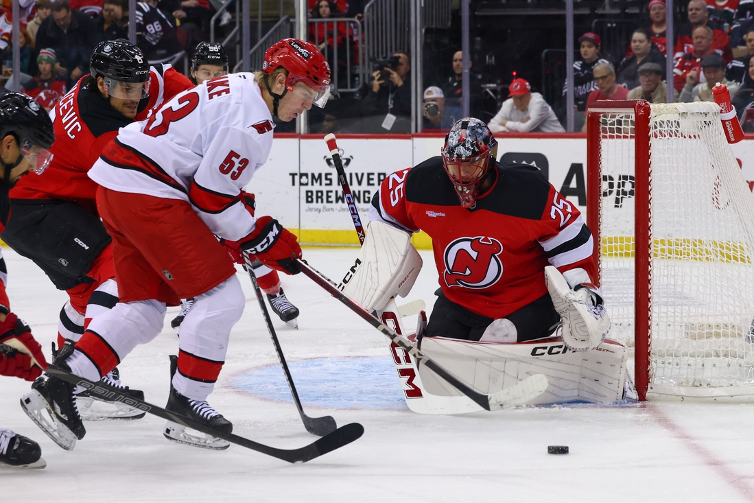 The teams traded turnovers before Bratt scored just under six minutes later. Hughes’ pass deep in the Carolina zone was picked off by Roslovic, but Roslovic’s backhanded dish was intercepted by Ondrej Palat. The left winger passed to Hughes, who was stationed to the left of Martin, before Hughes fed Bratt for a point-blank power-play goal with 5:15 left.
