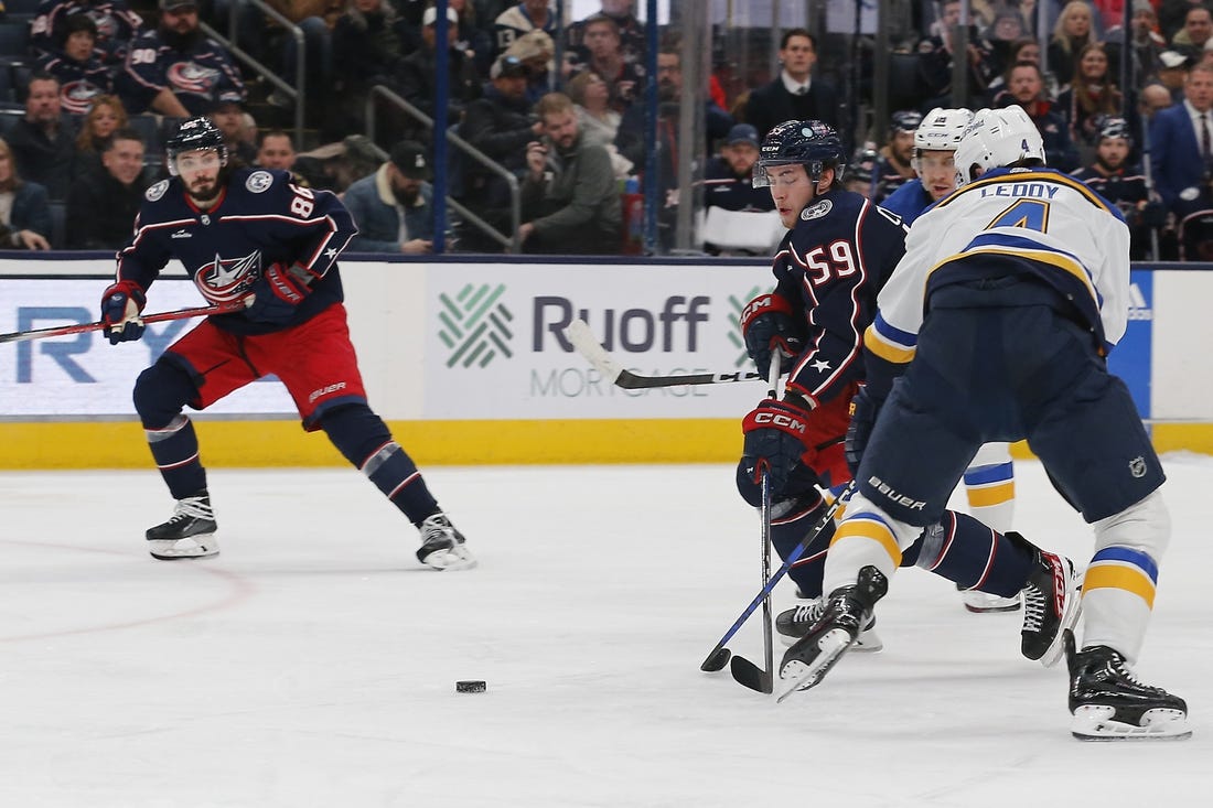 The Blue Jackets stretched the lead to 3-1 at 6:26 of the third period after Voronkov stole the puck in the St. Louis zone and led the rush the other way. He passed the puck to Marchenko, who fed Chinakhov for the redirection.