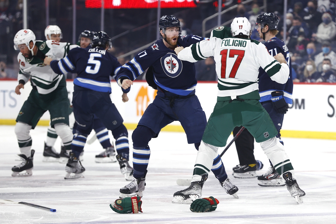 Emotions ran high during the game, which featured three fights, including two between the Wild’s Marcus Foligno and the Jets’ Adam Lowry. Foligno appeared to knee Lowry while he was on the ice after the second skirmish, which could prompt a review from the league.