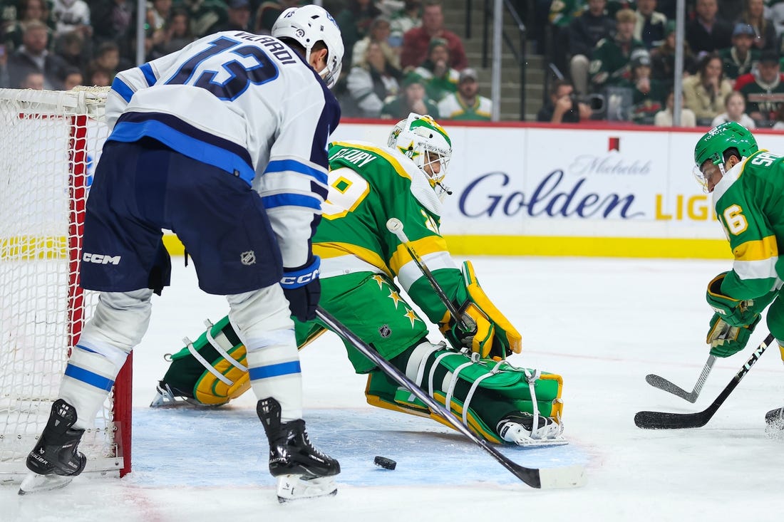 The Wild played without top scorer Kirill Kaprizov, who was injured Saturday when he was cross-checked from behind by Jets defenseman Brenden Dillon.