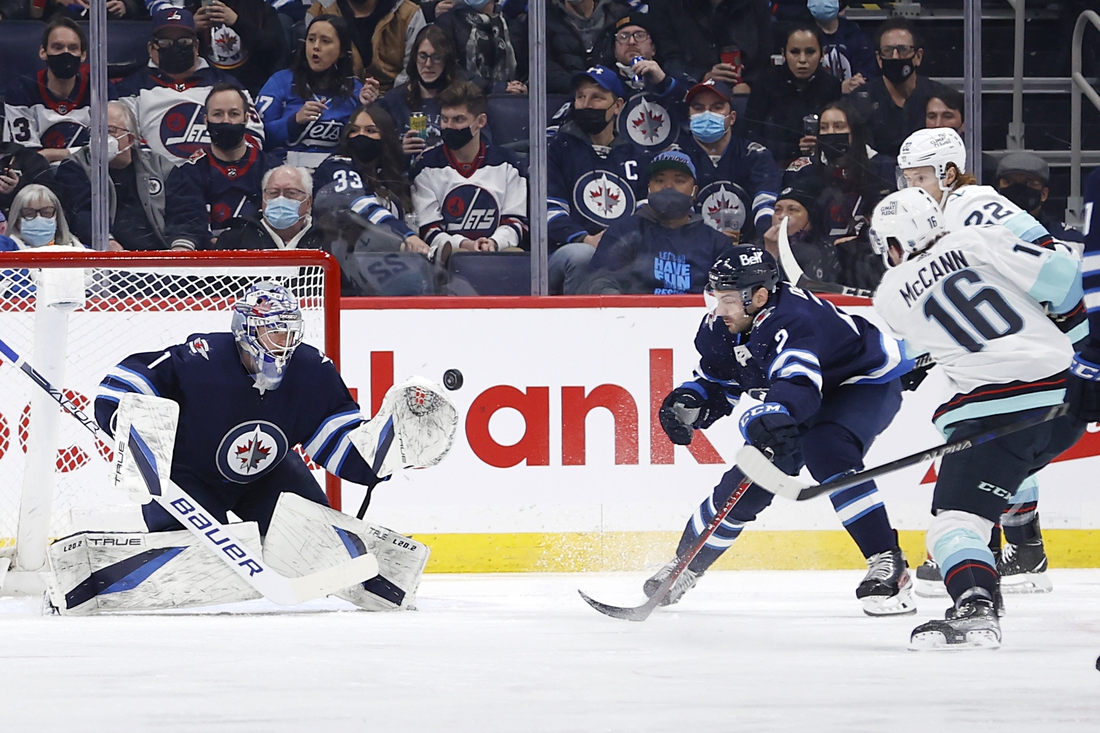 The Jets opened the scoring at 3:47 of the first period. Barron intercepted a pass by Seattle rookie Matty Beniers just inside the defensive blue line and passed ahead to Harkins to start a two-on one rush. Barron took a return pass and lifted a shot over Driedger’s shoulder.