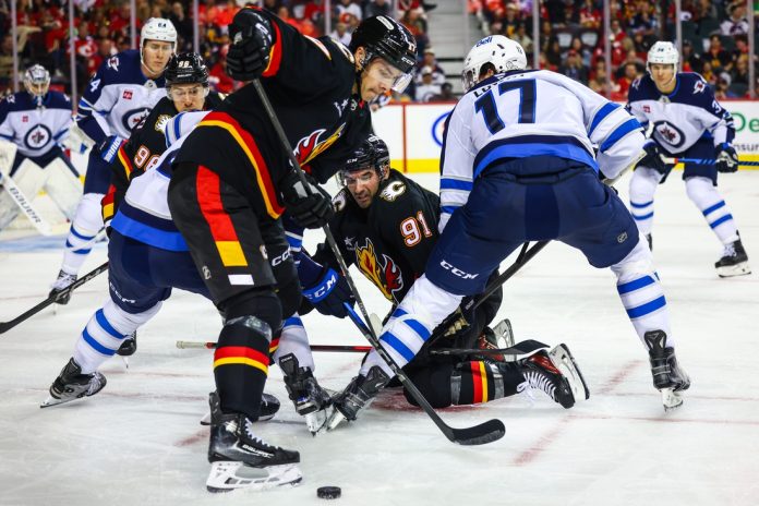 Andersson tied the game with his fourth of the season late in the second period by lifting another sharp-angled shot that beat Comrie, but Samberg put the Jets ahead again 61 seconds into the third period with another fortunate bounce. His shot banked off the end boards, ricocheted off the stick of a Flames defenseman, off Wolf and into the net for his second of the season.