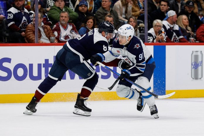 The game was scoreless until MacKinnon broke through against Hellebuyck at 6:09 of the second period. MacKinnon got a pass at the top of the zone, skated down the right slot and wristed a shot off the right post. He got his own rebound and snapped it by the diving Hellebuyck to open the scoring.