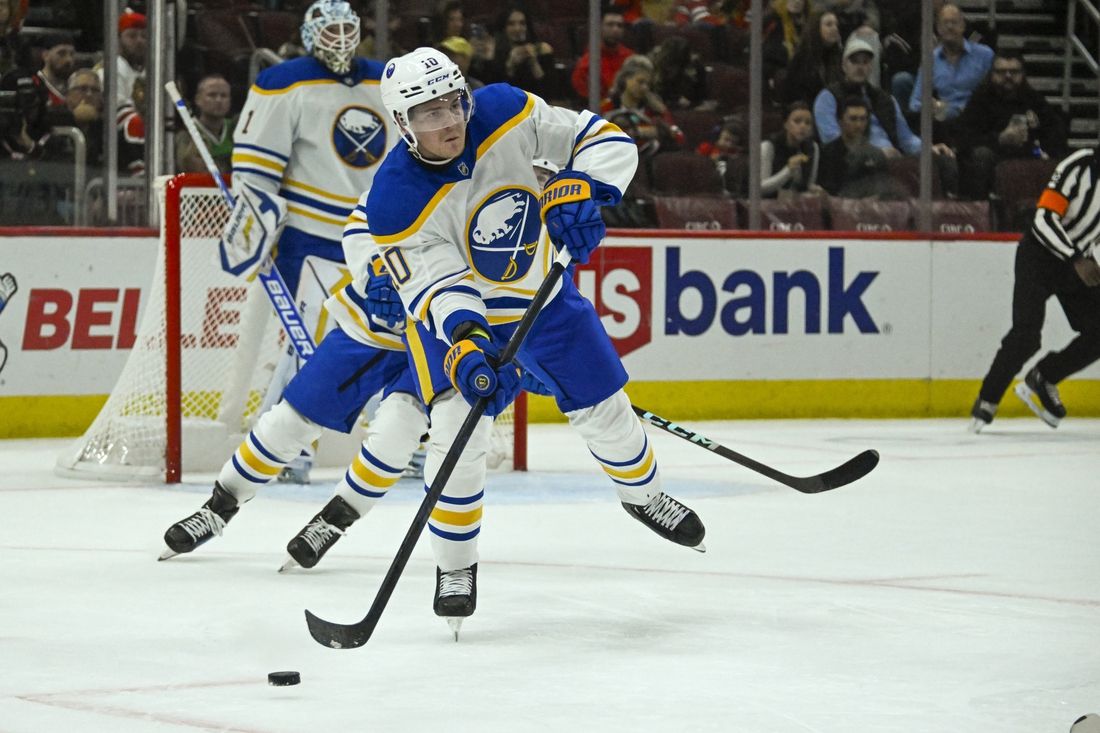 Thompson opened the scoring at 8:39 of the first period. Peterka carried a short pass from Alex Tuch through the neutral zone inside the Chicago blue line, where he dished a backhand feed over to Thompson for a wrister from above the circles that beat Soderblom blocker side.