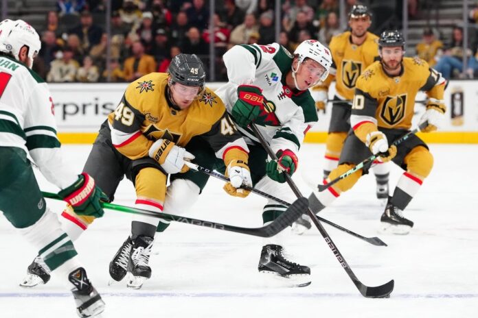 Minnesota took a 4-2 lead in the third period with two goals in 61 seconds. Rossi got the first when he jammed the rebound of a Boldy shot under Hill’s right pad at 6:28. Boldy followed with a shot from the right goal line that caromed in off Hill’s left shoulder and into the net.