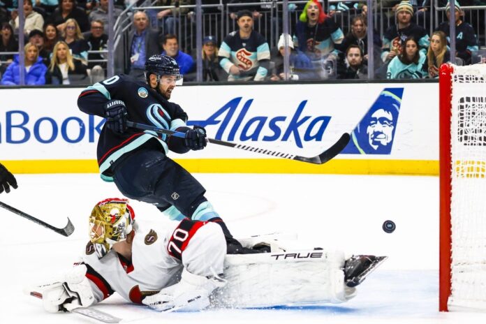 The Kraken made it 3-0 at 19:03 of the second after Ottawa’s Tim Stutzle lost an edge just inside the offensive blue line, leading to a two-on-one Seattle rush. Kailer Yamamoto skated the puck down the right wing before making a centering pass to Burakovsky, who beat Korpisalo with a wrist shot just inside the left post. Burakovsky was playing in just his 10th game of the season after a pair of stints on the injured list.